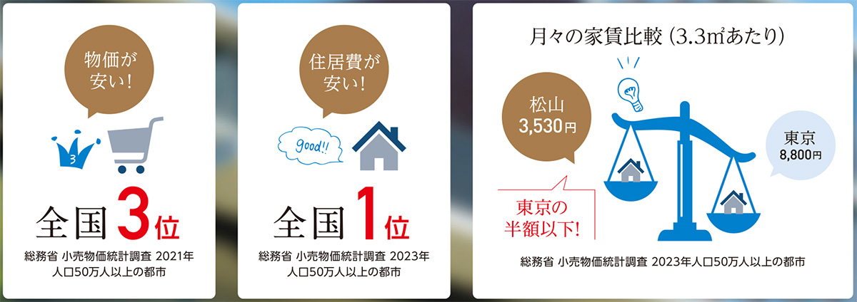 住みやすさ抜群の松山!人口約50万人の都市でありながら、家賃の安さも魅力。さらに物価も安く、一人暮らしをしている学生はみんな「住みやすい」と口をそろえます。松山だからこそ、思い描いたキャンパスライフを自由に送ることができます。
